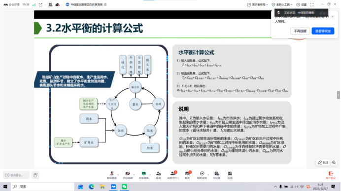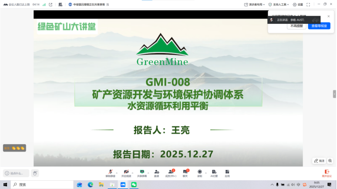 2025年12月27日,中关村绿色矿山产业联盟(简称“中绿盟”)组织第三十一期绿色矿山科技特别专员活动,中绿盟副理事长兼秘书长王亮为100多名专员进行了资源开发与环境保护协调体系:水资源循环利用平衡的知识培训,王亮秘书长从水资源循环利用平衡的基础概念、输入输出关系、关系模型、技术路径等方面进行展开,使参会人员对于绿色矿山平衡体系有进一步的了解。