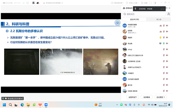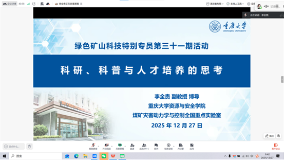 2025年12月27日,中绿盟组织第三十一期绿色矿山科技特别专员活动,重庆大学的李全贵副教授为100多名专员做了以"瓦斯"为主题进行科研与科普的实践经验,认为科研与科普相互促进,科研提供了科普的内容支撑,而科普又能反哺科研,加深对行业的理解,并根据实际需求调整研究方向。分别从瓦斯行业的法律法规、瓦斯分布的多维认识、瓦斯灾害防治、瓦斯的未来以及关于科研科普的一些思考等方面做了讲解。