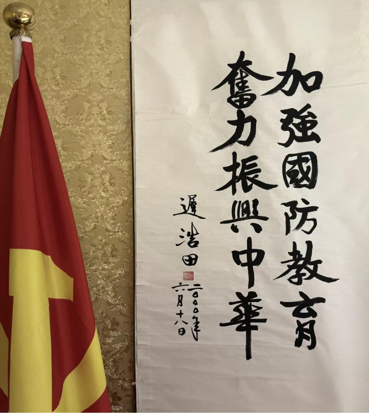 本次书画展有幸展出了第十五届中央政治局委员、中华人民共和国国防部原部长迟浩田上将,于2000年6月18日为国防教育题写的“加强国防教育 奋力振兴中华”等多幅珍贵墨宝。