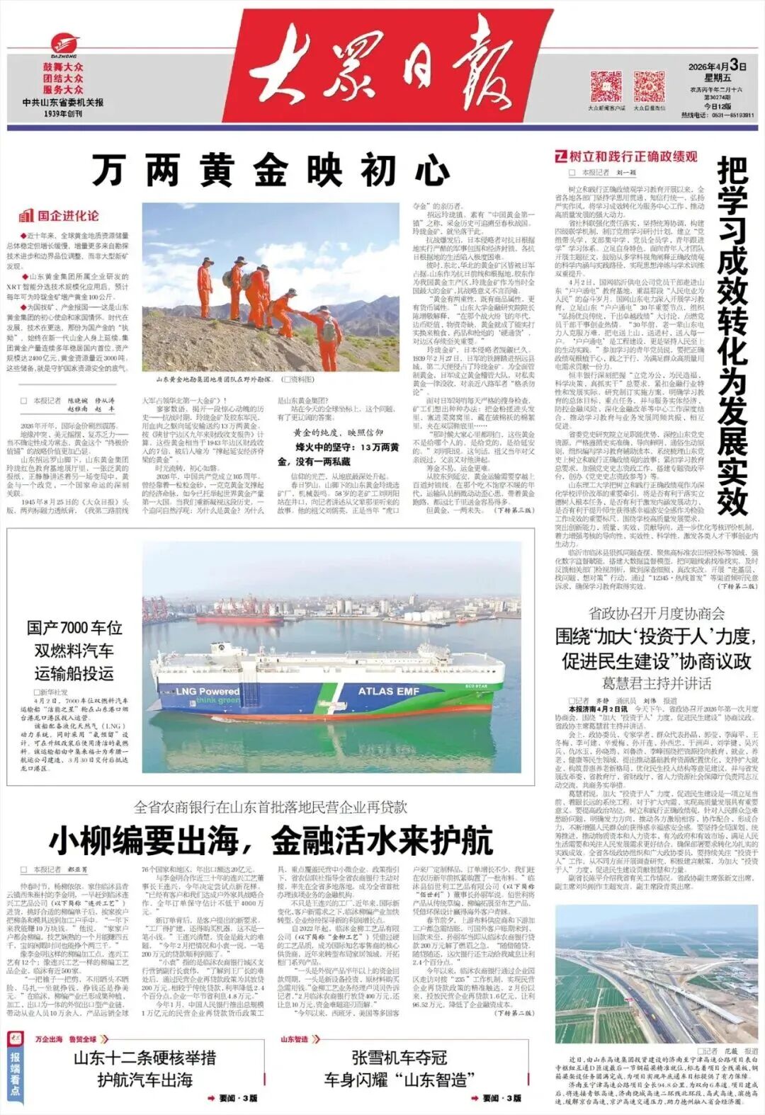 “‘十四五’以来,集团黄金产量连续多年稳居国内首位,资产规模达2400亿元,黄金资源量近3000吨。”山东黄金集团党委书记、董事长张晓海说,“为国找矿、产金报国——这就是山东黄金集团的初心使命和家国情怀。”