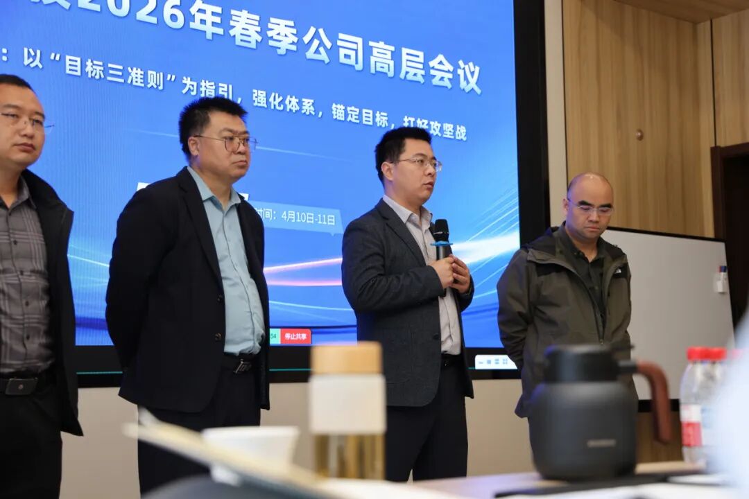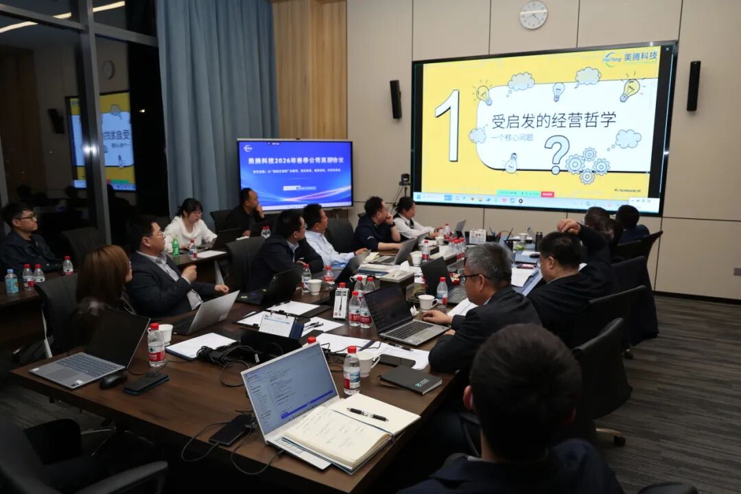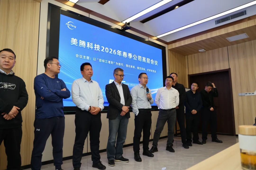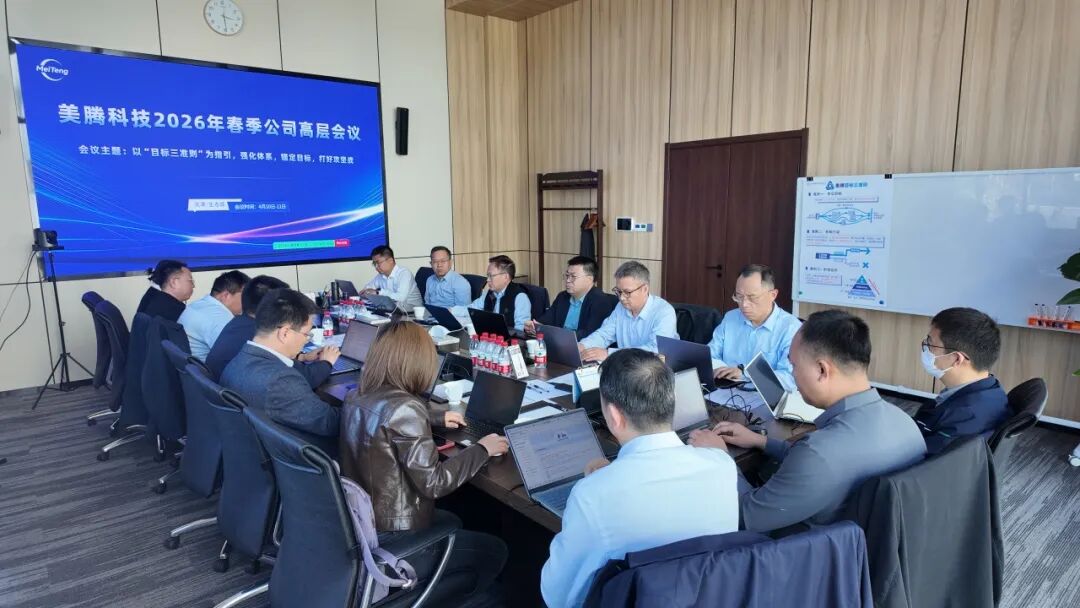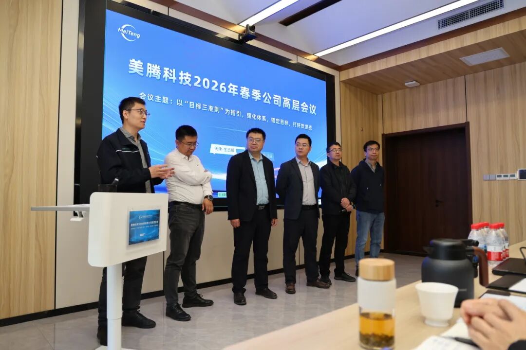 春风送暖,海棠花开!在这充满希望、生机盎然的春日里,美腾科技于4月10 - 11 日在天津生态城办公区召开了2026 年春季高层会议,本次会议主题为“以美腾目标三准则为指引,强化体系,锚定目标,打好攻坚战”。公司高管、准高管、管理总监、八个一级单位负责人及各部门负责人齐聚一堂,通过复盘总结、专题研讨、现场交流等形式,凝聚发展共识,部署二季度重点工作。