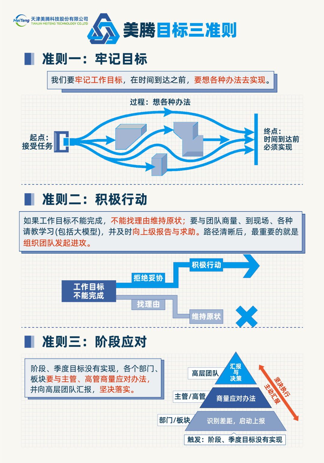 思想铸魂 以美腾目标三准则校准行动方向 在目标执行能力讨论环节,全体参会人员深入学习 “美腾目标三准则” 核心内涵。 牢记目标——我们要牢记工作目标,在时间节点到达之前,要想各种办法去实现; 积极行动——如果工作目标不能完成,我们不能找理由维持原状;我们要与团队商量、到现场、各种请教学习(包括大模型);并及时向上级报告与求助。路径清晰后,最重要的就是组织团队发起进攻。 阶段应对——阶段、季度目标没有实现,各个部门、板块要与主管、高管商量应对办法,并向高层团队汇报,坚决落实。 随后的读书分享讨论环节,参会人员结合美腾科技的经营理念,开展《经营十二条》读书分享与案例研讨,从管理方法、团队建设、风险防控等多个维度,探讨如何将经营准则转化为日常工作的具体行动。大家立足岗位,分享实践经验,提出改进建议,现场氛围热烈。 读书分享 靶向攻坚 破解发展中的痛点堵点 4月11日,会议在一场朝气蓬勃的晨跑中拉开序幕,为全天的议程注入了澎湃活力。 会议聚焦“问题解决”,围绕市场执行与风险防控开展专题研讨。市场环节明确拓展、维护、交付的执行路径与责任分工;风险环节引入“红线”思路,全面梳理潜在风险。 同时,针对车间设备现场问题,参会人员围绕设备外观优化、研发制造改进、现存痛点解决等内容展开交流,确保后续整改工作快速启动。 会议高潮,全体参会人员共同确认二季度重点工作,八个一级单位围绕公司目标进行任务分解,明确了各板块的工作重点、时间节点与责任分工。各部门将以 “时不我待、只争朝夕” 的紧迫感,锚定目标、狠抓落实,确保各项工作按计划推进。 自我批评 在反思中提升管理能力 “批评与自我批评,是提升管理能力的重要武器。” 在自我批评与对策环节,参会人员围绕 “如何把自己与团队的工作理清楚”、“如何做让上级、自己、员工都满意的工作” 等问题,开展深刻的自我剖析。大家对照工作要求,反思自身在目标管理、团队建设、问题解决中的不足,提出具体改进措施。 李总在自我批评环节重申了美腾科技 “内靠奋斗、外控风险” 的经营理念,强调各级管理者要直面问题、改进不足,以更高标准要求自己,带领团队高效推进各项工作。 本次春季高层会议,既是一次复盘总结会,也是一次思想统一会、工作部署会。美腾科技全体管理者将以此次会议为新起点,以 “美腾目标三准则” 为指引,强化管理、压实责任,以奋斗者的姿态攻坚克难,全力以赴完成年度目标,推动公司高质量发展再上新台阶!