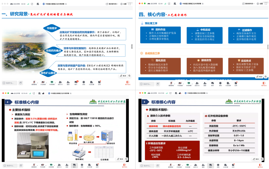中绿盟相关负责人在会上对百忙之中参会指导的各位专家表示感谢,也对标准编制团队的精心筹备与辛勤付出予以肯定。据介绍,本次参评的 5 项标准均紧扣矿业产业发展痛点与需求,具有极强的行业针对性和应用价值。其中 3 项标准围绕苯磺酸危废衍生选矿药剂展开,分别覆盖复配改性、生产操作、性能环保评价三大维度,对推动危废资源化高效利用、缓解选矿行业环保压力具有重要指导意义;《矿用无患子皂苷基复配活性剂》聚焦天然环保型选矿助剂研发与应用,高度契合绿色矿业发展的时代要求;《液体介入煤矸红外识别技术规范》则针对煤矸分离这一矿业分选关键环节,为提升分选效率、减少资源浪费提供了标准化技术支撑。