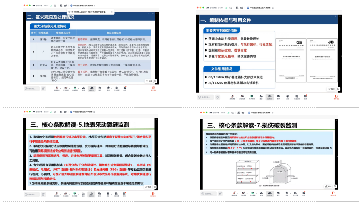 本次评审的 4 项标准聚焦岩石测试、支护材料、岩层移动监测、矿柱安全预警等绿色矿山核心技术领域,填补了相关技术规范空白,对提升矿山工程测试精度、强化深部开采安全管控、推动矿山数字化与绿色化发展具有重要支撑作用。