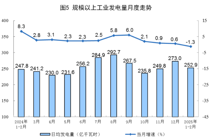 规上工业电力生产略有下降。1—2月份,规上工业发电量14921亿千瓦时,同比下降1.3%;日均发电252.9亿千瓦时,同比增长0.4%。