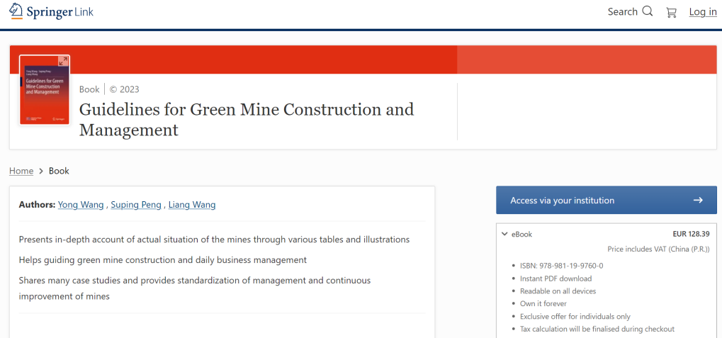 2023年2月,由中国矿业大学(北京)彭苏萍院士、北京科技大学王勇副教授、中关村绿色矿山产业联盟王亮秘书长等人共同完成的绿色矿山英文专著《Guidelines for Green Mine Construction and Management》,在国际著名出版商Springer正式出版。这是继在国际著名出版社商Springer出版《Interpretation of Green Mine Evaluation Index》之后的又一重大力作。