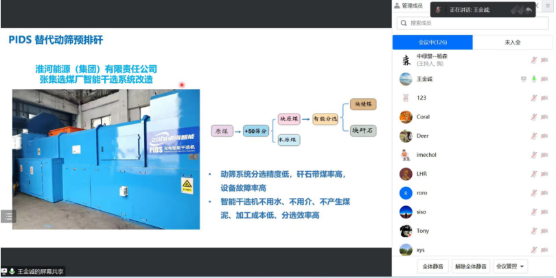 合肥泰禾卓海智能科技有限公司副总经理王金诚博士分享了X射线矿物智能分选技术设备及应用的报告,王博士从泰禾卓海智能分选设备原理、关键部件研发成果、“AI分选·绿色矿山新动能”应用场景、分选技术需求及发展方向思考等五个方面做了讲解交流。
