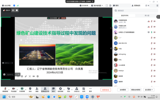 会议邀请了中关村绿色矿山产业联盟王亮秘书长、中国煤炭地质总局水文地质工程地质环境地质勘查院吴涛、齐鲁工业大学孙会来、中石油冀东油田唐山冀油瑞丰化工有限公司刘怀珠、内蒙古伊金霍洛旗生态绿化建设委员会办公室王泽、辽宁省物测勘查院有限责任公司 白英昌等专家和老师,分别围绕绿色矿山第三方评估过程记录有效性编写方法、鱼洞河酸性废水(AMD)形成机理研究及治理技术、绿色智慧矿山建设案例分享、碳捕集、利用与封存技术、矿山地质环境治理恢复基金计提使用、绿色矿山建设技术指导过程中发现的问题等方向进行了精彩汇报。