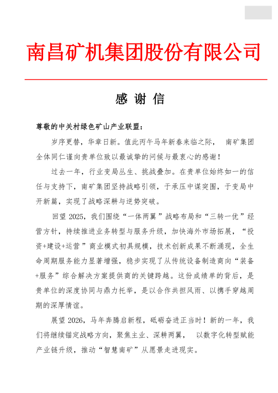 来自南昌矿机集团股份有限公司的感谢信