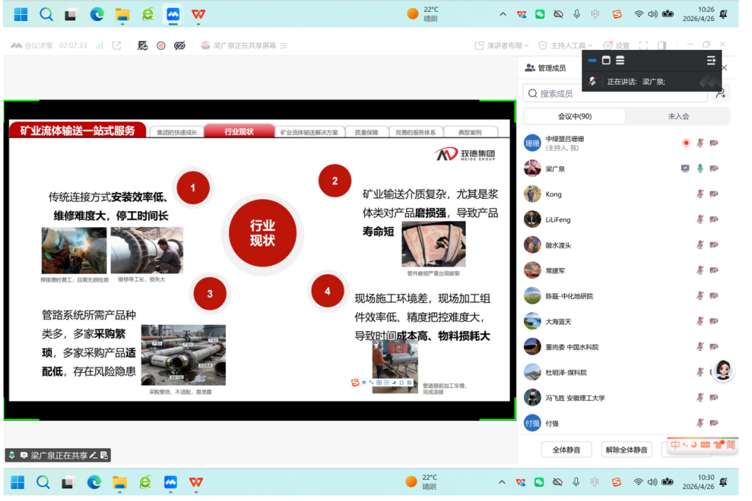 随后,会议邀请了多位行业专家进行精彩报告,包括中关村绿色矿山产业联盟副理事长兼秘书长王亮、北京科技大学张基伟副教授、玫德集团有限公司梁广泉高级工程师、京东工业备品备件业务部能源行业解决方案负责人马立波、山东黄金集团孟文文环保主管、科技特别专员等。他们分别就土地损毁与复垦平衡、地下工程冰冻壁垒-人工冻结法、玫德集团矿业浆体输送解决方案、京东工业数实一体备件供应链管理解决方案、提升绿色矿山建设质量,助力绿色低碳高质量发展等议题进行了深入分享。最后参会人员进行投票,玫德集团有限公司梁广泉高级工程师和山东黄金集团孟文文环保主管被评为“红旗”专员。