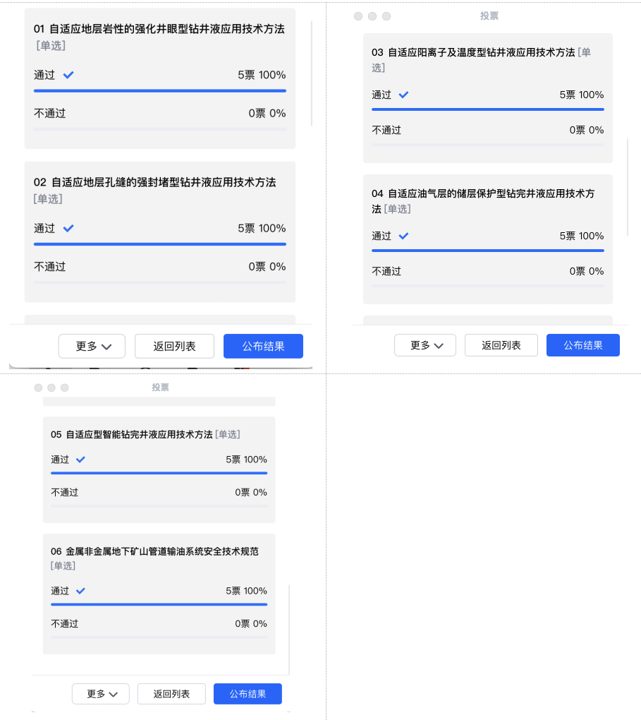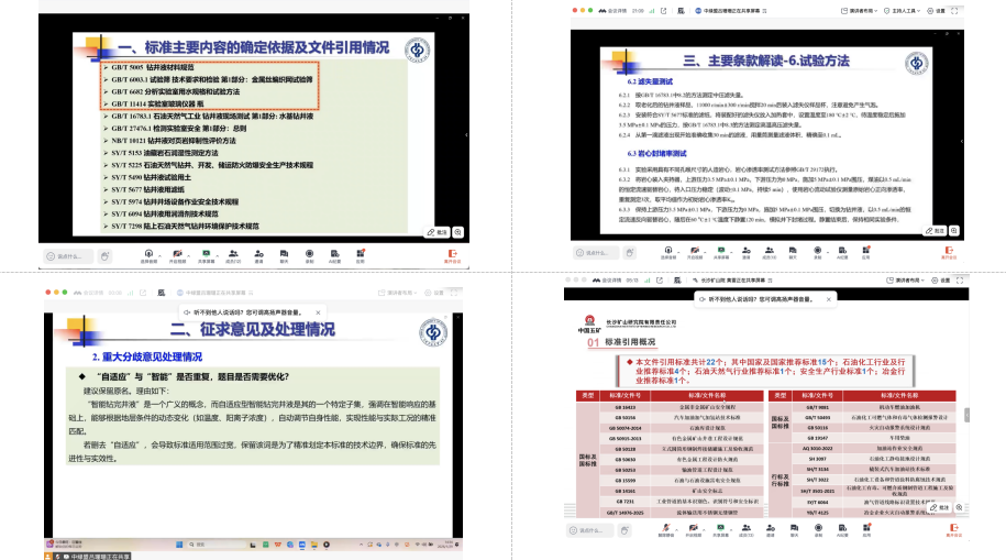 参加本次评审的6个团体标准起草人逐一对标准的标准主要内容的确定依据及文件引用情况、征求意见及处理情况(包括重大分歧意见处理情况)、标准的主要章节内容及核心条款解读等工作进行了详细汇报,标准化专业委员会的专家与起草单位进行充分的沟通并进行了投票表决,6项团体标准顺利通过发布评审。 ![]() 参加发布评审的6项标准分别为: 中国石油大学(北京)等单位完成的《自适应地层岩性的强化井眼型钻井液应用技术方法》《自适应地层孔缝的强封堵型钻井液应用技术方法》《自适应阳离子及温度型钻井液应用技术方法》《自适应油气层的储层保护型钻完井液应用技术方法》《自适应型智能钻完井液应用技术方法》,金川集团股份有限公司等单位完成的《金属非金属地下矿山管道输油系统安全技术规范》。