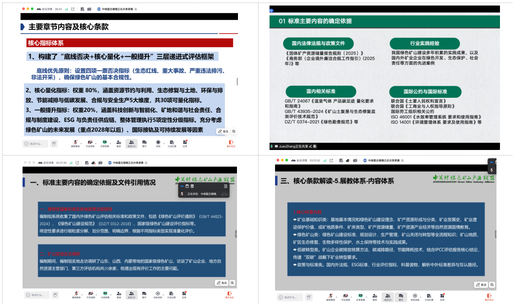 2026 年 4 月 24 日,中关村绿色矿山产业联盟以线上形式顺利召开2026 年度第六批绿色矿山团体标准发布评审会。本次会议通过腾讯会议平台举行,联盟标准化工作委员会专家、标准起草组代表齐聚 “云端”,严格按照规范流程对 4 项绿色矿山领域团体标准开展集中评审,为绿色矿山标准体系建设再添重要成果。