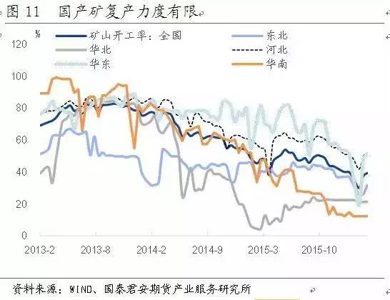 1-2月我国累计进口1.56亿吨铁矿石,较去年同期增加923.97万吨,增幅6.40%,虽然前两月的进口矿出现明显增长,而同时期我国内矿产量下降非常明显,用倒推法计算的国产矿实际产量1-2月较去年同期下降1792.25万吨(折算为标准品),截止到三月中旬,国产矿开工率均值为36.44%,而去年同期为49.37%,大降12.93%, 也就是说2016年一季度整个铁矿供应端是较去年略微偏紧的。