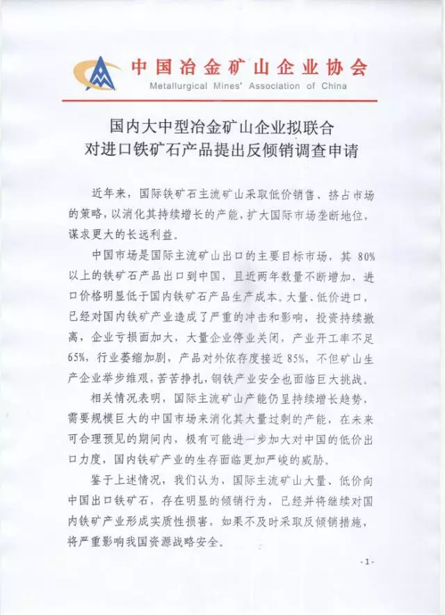 7月25日,国内20余家大中型矿山企业联合作为申请人,由中国冶金矿山企业协会代表国内铁矿产业向商务部提出反倾销调查申请,请求对原产于澳大利亚、巴西的铁矿石产品进行反倾销调查。