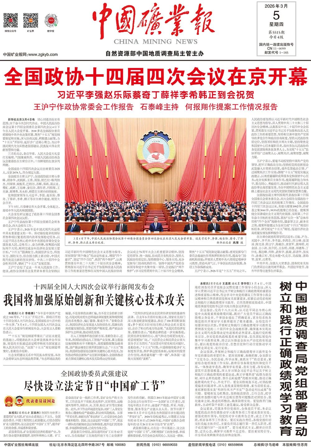 武强委员介绍说,国际通用的矿工日为12月6日,旨在致敬矿工在高危环境下为工业资源开发作出的贡献。我国自2011年起由中国矿业联合会设立行业性节日——全国矿业工作者日,原为每年的2月17日,涵盖矿产勘查、开采、科技、管理、服务等全产业链从业人员。该节日源于1950年2月17日毛泽东为我国留苏学生题词的“开发矿业”。2024年经权威考证,日期更正为每年的12月31日;自2025年起,中国矿业联合会将每年的12月26日至31日设为“矿业周”。