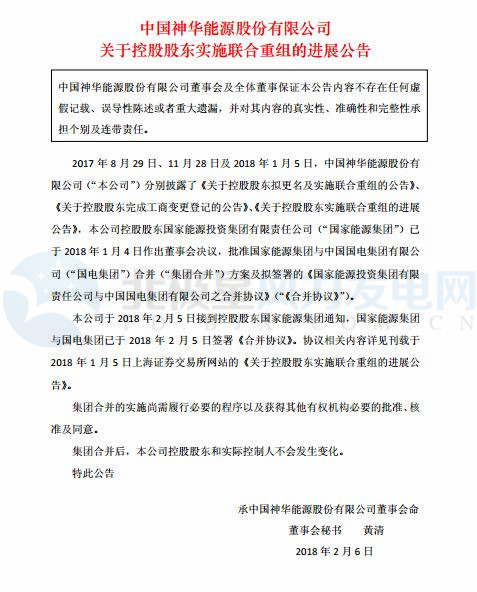 中国神华2月5日晚间发布公告,该公司于2018年2月5日接到控股股东国家能源集团通知,国家能源集团与国电集团已于2018年2月5日签署合并协议,集团合并完成后,国家能源集团继续为该公司的控股股东。
